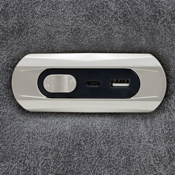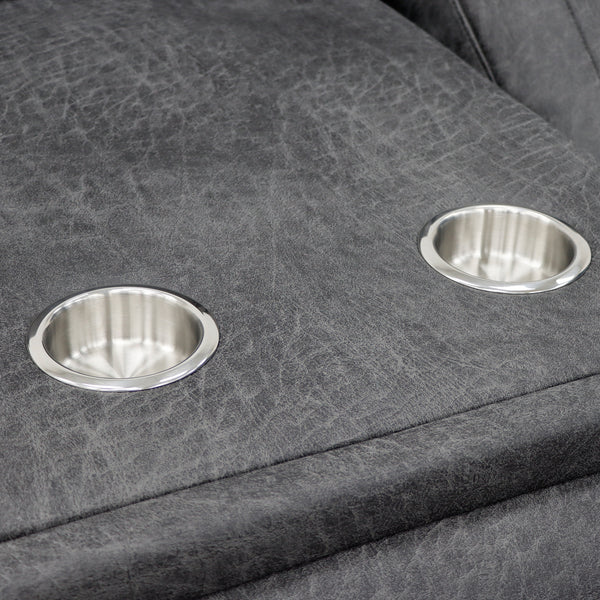 The Leon set features an electric recliner, dropdown table & cupholders, USB and USB-C charging ports. This is a classic design available in Grey Tech Fabric.