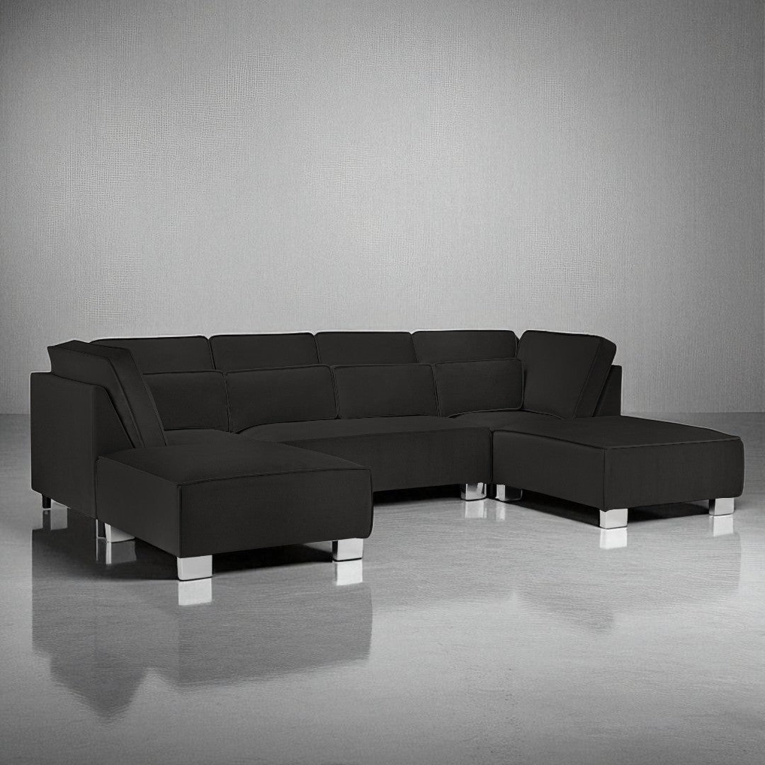 Redefine your living space with the luxurious and spacious Sloane Fabric U Shaped Corner Sofa in Black by Furniture in Fashion. Designed to offer exceptional comfort and contemporary elegance, this large U-shaped sofa is the perfect centrepiece for modern family living rooms. Its generous seating layout makes it ideal for entertaining guests, relaxing with loved ones, or stretching out in style. Upholstered in a premium Black fabric, the Sloane sofa brings a soft and sophisticated feel to any interior. Its deep cushioning, supportive backrests, and sleek low-profile design combine form and function to deliver both visual appeal and everyday comfort. Whether you're hosting a movie night or enjoying quiet downtime, the Sloan U-shaped sofa turns your lounge into a sanctuary of style and relaxation.